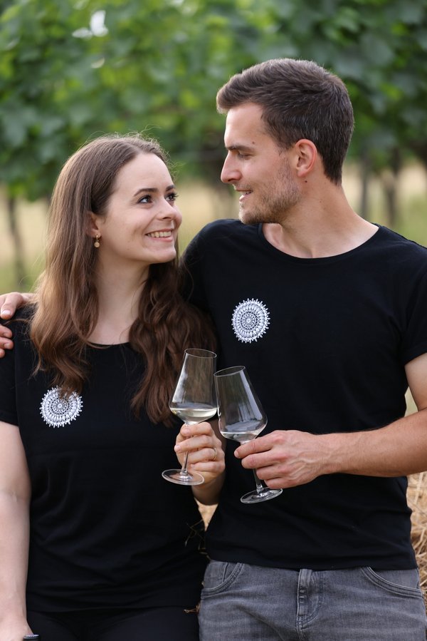 Motiv "Grauburgunder" auf der rechten Brust, das Logo klein im Nacken.